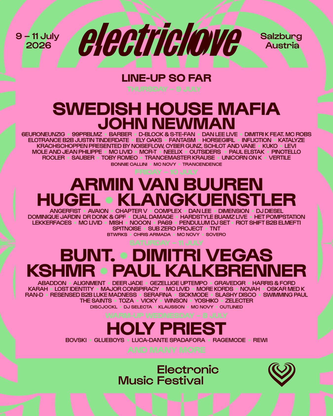 Electric Love je festival elektronske muzike koji se održava na trkačkoj stazi Salcburgring u jezerskoj oblasti Salckamergut u Austriji. Organizatori ga opisuju kao tri dana ispunjena ljubavlju i muzikom. Bez obzira da li volite dubstep, electro, house ili drum and bass – Electric Love ujedinjuje sve