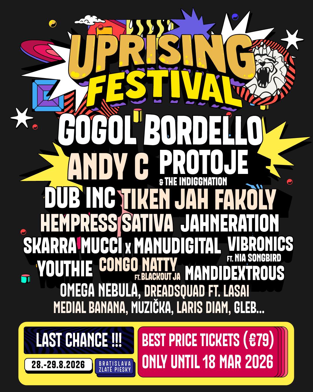 Uprising je jedan od glavnih evropskih festivala posvećen reggae i dancehall muzici. Lokacija u letovalištu Zlate Pieski na jezeru pretvorena je u utočište za fanatike ovog zvuka, sa autentičnom uličnom umetnošću, radionicama i časovima joge koji predstavljaju sastavni deo programa isto koliko i spisak izvođača.