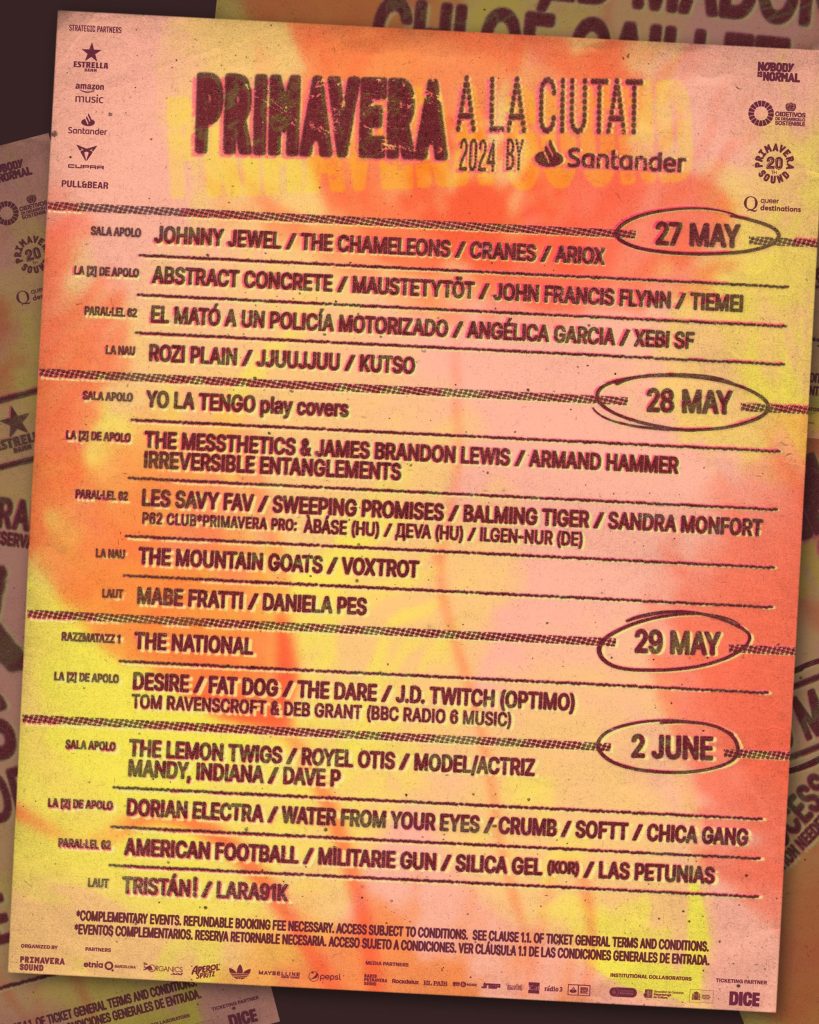 Bend The National se pridružuje programu Primavera a la Ciutat, koji obuhvata 49 svirki tokom četiri dana (27., 28. i 29. maja i 2. juna) i na šest lokacija (Sala Apolo, La (2) de Apolo, Razzmatazz, Paral -lel 62, La Nau i LAUT) tako da Primavera Sound ponovo postaje aktivan deo gradskog kulturnog kruga. To je skoro pa festival paralelan samom festivalu, kada će nastupati, između ostalih, Yo La Tengo koji priprema poseban repertoar obrada, American Football, The Lemon Twigs, Armand Hammer, Dorian Electra, The Chameleons, El Mato a un Policia Motorizado , The Messthetics, Les Savy Fav, Johnny Jewel, The Mountain Goats, Cranes, Maustetytöt i Desire. Sada možete da pogledate i kompletnu satnicu svih nastupa u svim klubovima.